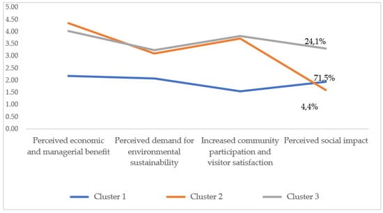 Cluster 2—socioeconomic type. This type involves the biggest group of the youth in terms of sustainable tourism (71.5%). The youth focus on long-term economic welfare of the region that can be achieved by effective management, planning, and active societal participation in implementation of tourism policy. The members of this group consider sustainable tourism as an important social and economic aspect (low evaluation in the graph of perceived social impact means the opposite—it shows a high position, since the statements of this factor contained a negative connotation).