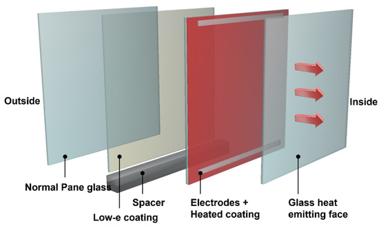 Heated glazing methods mainly involve inserting either heating film or heating wires and a conductive film coating. The transparent conductive film, a representative heating film, is made by depositing silver nanowire (AgNW) on the base film [29]. It is used for display glass due to its high transmissivity and is generally utilized in fields that operate with a low input voltage [30]. Conversely, heated glazing based on electrically resistant nichrome heating wires is mainly used to prevent frost on the rear glass of automobiles. In this study, we employed heated glazing made by depositing a transparent conductive oxide film consisting of fluorine tin oxide (FTO), heated through sheet resistance by forming a heating layer on one side of the glazing and connecting electrodes [31]. The basic structure of the FTO-coated heated window is shown in Figure 1. Glass with a Low-e coating was used to minimize heat flow to the outside, and the cavity was filled with gas with low thermal conductivity, that is, argon. Recently, the related research for quality improvement of graphene materials is being actively conducted [32], its utilization is expected to be very high, and the possibility of practical use has been proven through producing a uniform large-area graphene glass [33]. Graphene is emerging as a core material for the development of heated windows due to its high utility in electrical applications such as exceptional conductivity and thermal superiority [34,35].