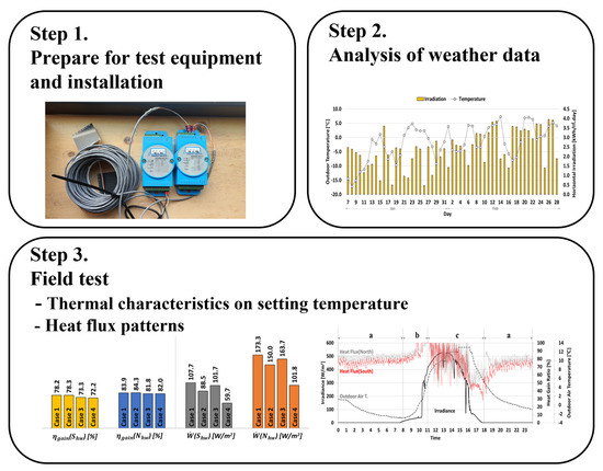 Figure 2 depicts the flow chart of the analysis process for this study. First, temperature sensors and heat flow meters were installed for each location, and pre-testing was performed to check the operation of the sensor. Network function providing equipment and internet router was installed to enable real-time monitoring and data collection. At the same time as the experiment, the outdoor air temperature and irradiance data were collected and then used for the analysis of thermal behaviors and heat flow patterns.