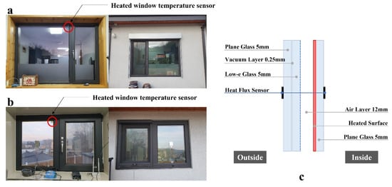 Inside and outside views of (a) the south-facing window and (b) the north-facing window; (c) schematic diagram of the vacuum-heated window.