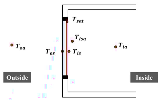 Figure 5 shows the temperature measurement points. The glass’s inner and outer surface temperatures were measured, and each room’s air temperature and relative humidity were also considered for the measurement. In addition, a temperature sensor was installed to measure the air temperature at a distance of 5 cm from the indoor glass surface, that is, the radiation temperature from the surface of the heated window. , the temperature sensor for controlling the heated window was located at the upper edge of each window. Table 1 shows the EKO heat flux meter (MF-200) [37] used in the experiments. The heat flow of this sensor was calculated using Equation (1).