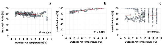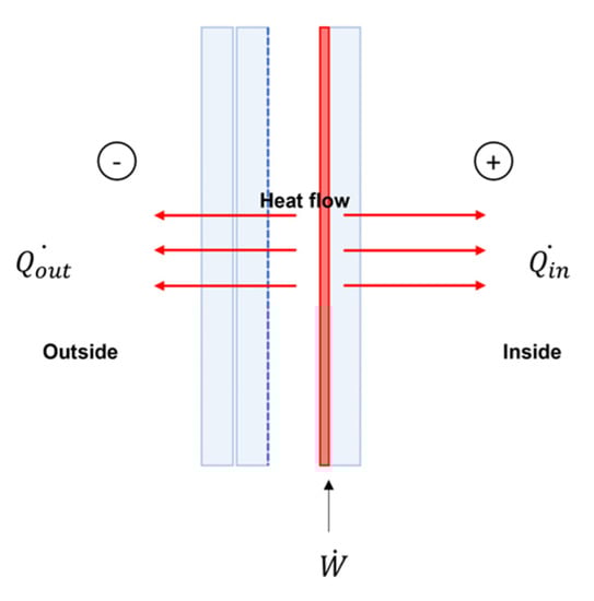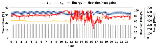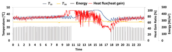 Figure 6 is a conceptual diagram of the heat flow from the heated window, where is the input power for window heating. is the amount of heat flow measured through the internal heat flow meter, which is always positive because the heat flow meter is turned on for 24 h, and the glass surface temperature is always higher than the surrounding temperature. is the value measured through the external heat flow meter, which is negative when heat is lost to the outside or positive when heat is gained to the inside under the influence of high solar irradiation and outdoor air temperature. Therefore, when the value of was positive, the heated window efficiency was assumed to be 100% because heat was obtained from both the inner and outer surfaces of the room. When the value of was negative, heat was lost to the outside and the efficiency (ηgain) was derived through Equation (2).