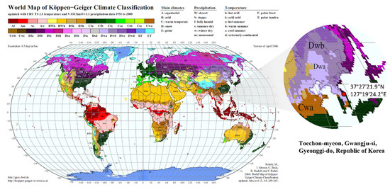 - WORLD MAPS OF KÖPPEN-GEIGER CLIMATE CLASSIFICATION Tilgjengeleg på. Available online: http://koeppen-geiger.vu-wien.ac.at/present.htm (accessed on 10 December 2021).