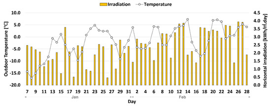 Figure 8 shows the outdoor temperature and solar irradiation during the experimental period. January and February are generally the coldest months of the year in South Korea, and the coldest days were selected for the experiments because the heated window is favorable for heating. As a result during the experimental period, the average daily irradiation and outdoor air temperature were 142.3 Wh/m2 and −3.8 °C in January and 249.8 Wh/m2 and 0.4 °C in February, indicating a slightly milder climate in February than in January.