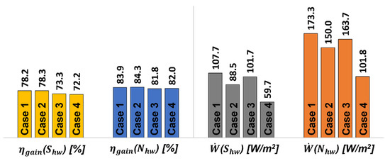 Case 4 shows the analysis results from the experiments in February, when the heating window’s operating temperature was fixed at 27 °C. The experiment was performed under higher average irradiation and outdoor air temperatures than the January experimental period (cases 1 to 3). Nighttime values for the south-facing and north-facing heated windows were approximately 33 °C, which were about 6 °C higher than . The value for the south-facing heated window was 6.0 °C and the average daily temperature difference between this value and the inner surface temperature of the glass was 27.7 °C, which was much smaller than the values recorded in January. The temperature difference between and was 5.5 °C for the south-facing heated window and 8.6 °C for the north-facing heated window. Moreover, the energy input of the north-facing heated window was approximately 41.6% larger than that of the south-facing heated window.