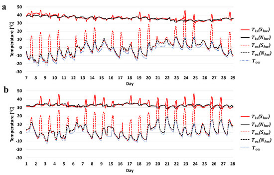 In case 2 (Tsat = 29 °C), the average irradiation of the analysis period was 141.4 W/m2, and the average daily nighttime and daytime outdoor air temperatures were −5.9 °C and −2.3 °C, respectively, which were approximately 5 °C higher than those in the previous analysis period, despite the lower irradiation. for the south-facing and north-facing heated windows during the nighttime was approximately 36 °C, which was approximately 7 °C higher than . The average for the south-facing heated window was 1.7 °C. The temperature difference between the inner and outer surfaces was approximately 34.8 °C, which was less than that in case 1. The temperature difference between and was the same as that in case 1 for the south-facing heated window but was approximately 3.5 °C for the north-facing heated window. The average daily temperature difference between and was 7.8 °C for the south-facing heated window and 12.4 °C for the north-facing heated window. For the north-facing heated window, the average was −1.1 °C and the inner surface temperature of the glass was 35.8 °C, resulting in a temperature difference of 36.9 °C, which was slightly larger than that for the south-facing heated window. The energy input of the north-facing heated window was approximately 50.0% larger than that of the south-facing heated window.
