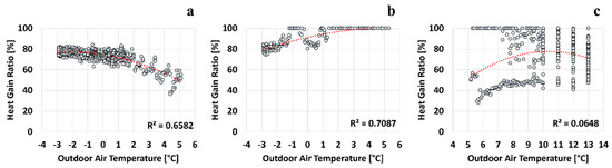 - Three heat flux patterns of the heated window were observed each day. In pattern (a), the efficiency increased as the outdoor air temperature decreased. In pattern (b), the efficiency increased as the outdoor air temperature increased. In pattern (c), which was observed during the daytime, the heat flow was unstable, and no correlation was observed with the outdoor air temperature. These daily patterns occurred in both January and February.