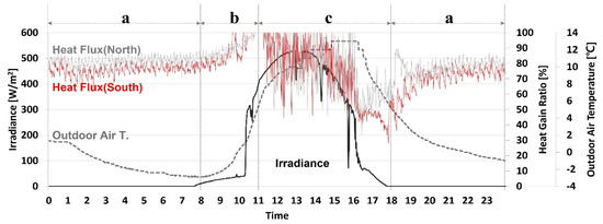 The south-facing and north-facing heated windows exhibited three heat flux patterns per day, as shown in Figure 11 and Figure 12. For pattern (a), which was observed between 00:00 and 07:00 and between 18:00 and 23:00 (irradiance = 0 W/m2), the sensitivity analysis results for the outdoor air temperature and heat gain ratio showed that the efficiency of the heated window decreased as the outdoor air temperature increased. For pattern (b), which was observed between 08:00 and 10:00, the efficiency of the heated window increased as the outdoor air temperature increased. There was no significant correlation between outdoor air temperature and heat flow for pattern (c), which occurred between 11:00 and 17:00, with the highest average irradiation of approximately 340 W/m2. Figure 13 and Figure 14 show the analysis results per minute for a representative day; on this day, the three heat flux patterns were most clearly identified due to the most stable irradiation. From 11:00 to 17:00, the south-facing heated window was not in operation during the daytime due to high irradiation, and the inner surface temperature of the glass increased to a maximum of 46 °C. At the same time, the temperature of the glass on the northern side increased to a maximum of 33 °C, but the heated window was continuously operated. Large input energy was required to increase the temperature of the glass lowered by repeated on-off operation. The peak load in the corresponding period was 356 W/m2, which was higher than the peak load during the nighttime (331 W/m2). The heated window efficiency when the window was not in operation, i.e., during the nighttime, tended to increase as both the inner surface temperature of the glass and the temperature difference with the indoor air temperature increased. Figure 15 shows the outdoor conditions and heat flux patterns of the south-facing and north-facing heated windows on the representative day. The same heat flux patterns were observed during both the January and February analysis periods.