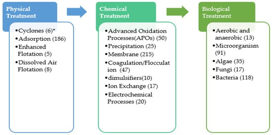 Figure 1 presents the technologies that were studied for the treatment of PW since 2016 [11,12,13,14]. The number of papers focusing on each subject was included in parentheses in Figure 1. It was observed that biological-based processes are the main technology used in PW treatment with a total of 274 papers. Additionally, membrane, adsorption, advanced oxidation processes (AOPs), and coagulation and flocculation observed among the most studied technologies with 215, 186, 50 and 47 papers, respectively. Generally, PW treatment is comprised of primary treatment processes, including solid settling, oil separation, emulsion removal using gravity settling, and dissolved air floatation. Conversely, chemical unit operations that include coagulation and flocculation are used to improve contaminant removal by enhancing solid separation. The removal of organic matters is carried out by biological processes via bacterial culture using the traditional activated sludge process. However, the high concentration of organic matter, possible toxicity, and inhibition can reduce the large-scale application of the biological process. Other physicochemical processes such as thermal technologies [9], density separation [2], adsorption technologies [10], membrane filtration technologies [11], chemical precipitation, chemical oxidation, and electrochemical methods [2,5,10,12] were used for PW treatment. The application of these technologies is limited due to the high cost and high energy requirement (e.g., thermal methodologies), extensive formation of sludge, need for the disposal of chemicals (e.g., electrochemical methods), complicated pre- and post-treatment (e.g., thermal methods, membranes, and adsorption), and low efficiency (e.g., membrane and electrochemical methods).