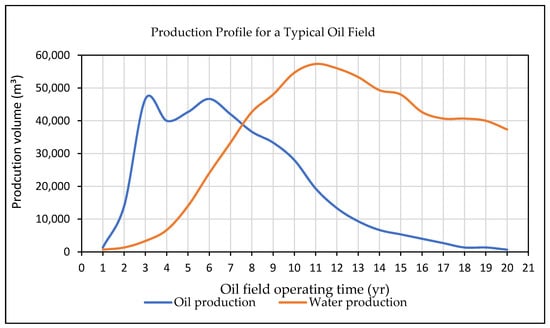 Water created as a by-product during the extraction of oil and natural gas is referred to as produced water (PW). This type of water is frequently found in oil and gas reservoirs, occasionally in a zone underneath the hydrocarbons, and in the same zone as the oil and gas. PW is a type of brackish and saline water that is brought to the surface from underground formations [19]. Typically, oil wells can generate enormous amounts of water together with oil, but gas wells produce water in smaller amounts. In 2018, it was estimated that the production of one U.S. barrel of oil (≈0.16 m3) was combined with of 3.13 barrels (≈0.50 m3) of PW [4]. This demonstrates that the water to oil ratio is approximately around 3:1. Reports indicate that oil fields account for more than 60% of PW generation worldwide [4]. Figure 2 illustrates how the age of the oil field directly effects the production rate of the PW [20]. By 2030, it is expected that the daily crude oil consumption will increase to 106.6 million barrels (≈17.10 Mm3) in comparison to 85 million barrels (≈13.6 Mm3) in 2006 [21]. Moreover, by 2030, the global daily production of PW is expected to reach approximately 246.9 million barrels (≈39.50 Mm3) [22]. In the United States, the annual production of PW was recorded to be 21 million barrels (≈3.40 Mm3) in comparison to the 50 million barrels (≈8.00 Mm3) that has been produced worldwide [23].