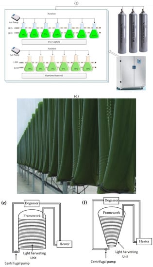 Open systems provide limited CO2 levels, which leads to limited photosynthesis processes and can folate some algal cells on the surface. Alternatively, PBRs exhibited an exemplary ability to monitor CO2 loading, oxygen build-up, and the concentration of the nutrient [81,83]. As the optimal light intensity varies between algal species, optimizing light intensity is necessary for algal cultivation [141]. As such, light—an essential component for CO2 adsorption and biomass production—has a limited penetration ability in an open cultivation system, whereas light can enter PBR systems.