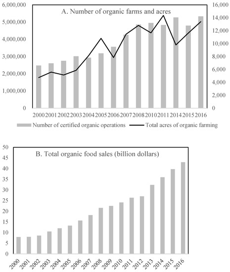 While the domestic supply of organic products seems to have stagnated in most recent years, the demand for organic agricultural products has increased consistently over the past decades. Plot B in Figure 1 shows that total organic food sales in the U.S. in the year 2000 were valued at about 7.9 billion dollars, but sales reached 43 billion dollars in 2016; total organic food sales are expected to continue to increase in the future [31]. As more and more consumers in the U.S. become aware of the benefits of organic food [32] such as food safety, friendliness to the environment, respect for animal rights, and stimulation of the rural economy, they would be more willing to buy organic products instead of regular farm commodities. A survey by the Organic Trade Association found that more than 84% of U.S. households purchase organic food sometimes while 45% buy organic agricultural products at least once a month. The rapidly growing demand for organic food has imposed great pressure on the U.S. organic sector which, as shown in plot A, is struggling to meet the needs of U.S. consumers.