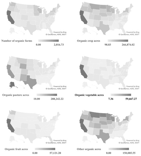 As can be seen from the first two top plots, most of the organic production in the U.S. is concentrated in the Western U.S. especially in California, while some states in the Midwest and Southwest such as Montana and Texas also show a booming organic sector. On the other hand, the development of the organic farm sector in the Southwestern U.S. is lagging. The mean organic agricultural acres of the Southeastern region were about 3145 acres, which was only about 1.2% of the total organic acres in California. The uneven distribution of organic farming across states and regions was also found by Taus, Ogneva-Himmelberger and Rogan who investigated agglomeration effects in the organic farm sector in the U.S. [17]. Other plots in Figure 2 present different types of agricultural products, also showing similar results—that farmers in the Southeastern regions may not equally enjoy the benefits of the booming organic sector.