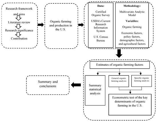 Figure 3 presents the research flowchart framework of this study. As the organic commodity market develops and integrates across the U.S., there is a greater demand for a comprehensive understanding of the key factors’ impacts on organic farming, and if they would effectively promote the organic supply in the U.S. This study fills in the research gap by looking at the macro-level factors and it will complement previous studies that focused on similar topics by looking at the farm level. The multivariate analytical framework with multiple year data enables this study to examine whether a series of factors can effectively promote organic farming and by how much. Meanwhile, a specific analysis of the organic farming sector for different crops would further corroborate the main results. This study provides evidence using state-level observations and a robust econometric method to further support the findings of relevant literature. Moreover, it also carries insightful policy implications for the construction and further promotion of the organic market that currently lags behind demand in the U.S.