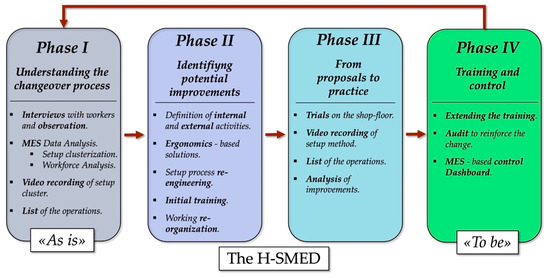 The Human-Centric SMED is based on four phases, guiding the transition from the “As Is” state to the “To Be” one, in an iterative kaizen cycle to generate valuable knowledge and learning about the changeover process (See Figure 1 below). Hence, H-SMED aims at increasing the availability of resources and, consequently, the efficiency of the system where it is applied. In the following subsections, the four phases are explained in detail as a roadmap towards the setup process improvement.