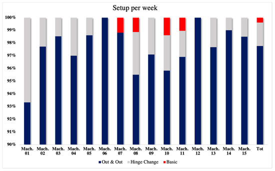 The next step to be applied was the MES data analysis. The hinging department is part of a complex manufacturing system, due to the high mix of products that every day are processed in large volumes and with different productive cycles. The priority at this point was to understand which family of setups was currently the most impacting on the department available capacity, in order to focus the H-SMED on it. The MES data driven analysis confirmed the clusterization of setups suggested by the interviews with the operators. The most frequent setup type could be identified as the “Out & Out” one, as reported on a weekly basis in Figure 2.