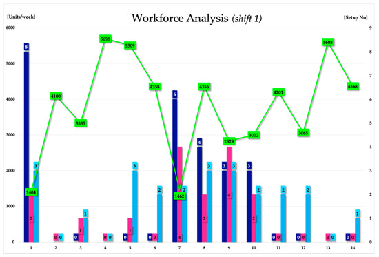 By exploiting data collected from the shopfloor IoT integrated resources, performances of the human resources of the hinging department were also analyzed, in order to optimize their tasks and define specific organizational roles. In Figure 3, an example of the production (see the green lines) and the number of setups performed by each operator of a shift for a given week is shown (see the blue bars for the “Out & Out” setup, the pink bars for the “Hinge change” setup and the light blue ones for the “Basic” setup). It can be noticed how there was a subset of workers who were in charge of most changeovers (see operators 1, 7, 8, 9 and 10), while a small subgroup was totally devolved to production only (see operator 2, 4, 13). The remaining workers (namely operator 3, 5, 6, 11, 12, 14) were hybrid figures who could be involved either in simple setups (e.g., “Basic” or “Hinge Change” type) or in production, with different efficiency (see the green line of production quantity). Similar patterns were recognized across different weekly periods and shifts.