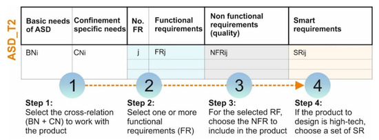 First, functional requirements define the functions of the system (technology or components). They specify the behavior between inputs and outputs of resources (information, energy, materials, or space), which are exchanged in the user–product environment. In the design process, it is necessary to have a correct translation of needs into functional requirements. In the ASDesign proposal, for all the crossed relationships of the module ASD_T1 (BN + CN), the functional requirements (FR) to be taken into account in the product design were identified. In addition to this, non-functional or quality requirements (NFR) were defined; these refer to the properties of the product (usability, safety, comfort, adaptability, performance, and transportability). Finally, the smart requirements (SR) for the design of high-tech products were identified. To facilitate the translation of needs (BN + CN) into requirements (FR, NFR, and SR), the module ASD_T2 was developed. Figure 1 shows the structure and its purpose and can be checked in detail in Annex I.