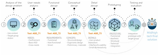 This section explains the ASDesign method in detail, specifically the applicability and steps to follow. It should be noted that the modules ASD_T1 (cross-relationships between ASD needs and special confinement needs), ASD_T2 (functional requirements), and ASD_T3 (design parameters) are the three basic tools of the method. These tools will be used throughout the design process of assistive products (medium or high technology) as facilitators in decision-making.