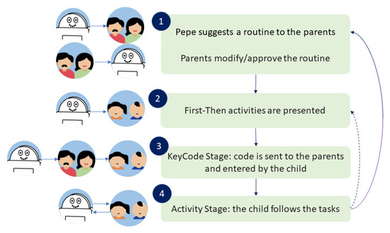 ASDesign is a user-centered design method; it is applicable in the development of assistive technology, in the form of interactive and smart products to support children with ASD in following a routine and managing tasks autonomously. The technology designed with this method can be used in periods of confinement; in addition, children can configure it comfortably and safely (and supervised by parents). In the ASDesign method, the term “confinement” is understood as a period in which someone is locked up or confined in a certain place or within limits [8]; this can be due to desirable reasons (teleworking, work-family reconciliation, vacations, etc.) and undesirable or unexpected reasons (rest or leave, illness, health emergency, etc.).