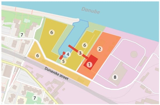 The complex of the ex-power plant and the nearby river port (from now on—Marina Dorćol) represents a spatio-functional unit that should be studied integrally (Figure 1), although planning documents targeting this area (e.g., the detailed regulation plan of Marina Dorćol []) recognize the plot with the power plant as a sub-unit with its own cadastral number (Figure 1—orange section).