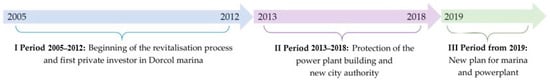 The initial year of the analysis (2005) was marked by the first official decisions and planning documents related to the future of this ex-industrial site, whereas the selected periods were defined by the changes in the city authorities that influenced the shifts of urban policies, the economic model of urban regeneration and the dynamics of undertaken activities (Figure 3). The first period (2005–2012) begins with the adoption of the detailed regulation plan of Marina Dorćol and its sale to a private owner, and it ends with the transfer of ownership to another private investor. The second period starts after the decision of the Government of the Republic of Serbia to declare the building of the ex-power plant as a cultural monument, officially confirming its cultural and architectural value. The ownership transfer from the investor to the City of Belgrade marks the end of this phase. Finally, the third ongoing period is characterized by a new decision of the city authorities to resell Marina Dorćol to a new private investor.