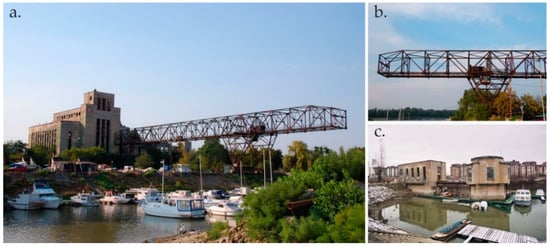 The building of the ex-power plant is located in the central district of Dorćol, in the Belgrade municipality of Stari Grad. It belongs to the former industrial zone (3 km long) stretching from Marina Dorćol to the Pančevo bridge. The part that is still active is situated around the port of Belgrade, where warehouses and customs office are located. Nowadays, the complex of Marina Doćol is an unused city land, mostly fenced and with a forbidden access. The only exception represents a narrow strip next to a marina pool, where the facilities and boats belonging to a nautical club are located. The building of the ex-power plant was built between 1930 and 1932, according to the project of the Swiss Society for Electrification and Traffic from Basel, and it consists of several parts: the main building, a gantry crane with a sleeve, a pumping station and a filter plant (Figure 4). The building occupies three cadastral plots and has a cubic shape with a rectangular base of 2800 square meters and a skeletal structure. A dominant element of the building is a gantry crane, which uses two electric motors to connect a distance of 140 m between the pumping station and the Danube.