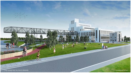 In August 2019, the Belgrade Land Development Public Agency published a new advertisement, triggering a new round of speculations related to the project Marina Dorćol. The public tender for the site was initiated at the price of RSD 3.8 billion, which is the estimated market value of four hectares []. In September, the Czech company MD Investments 2000 became a new owner, as the only bidder. The daughter company Sebre Marina Dorćol announced a future investment of EUR 150 million directed into a construction of a residential and business complex along the Danube. The construction was scheduled for 2021 []. The Deputy Mayor stated that the technical documentation for all facilities and contents should be approved by the Commission for Plans of the Belgrade City Assembly and in accordance with the conditions issued by the Institute for the Protection of Cultural Monuments []. However, the anticipated design of Marina (including the power plant as the Museum of Nikola Tesla) was announced during the official visit of the Serbian President to the Czech Republic in May 2021, before the official approval of the relevant expert bodies (Figure 7) [].