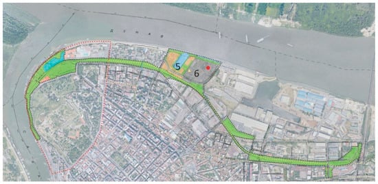 Linear park—the development segments, including the area of Marina Dorćol (5) and power plant (6). Source: Centre for Experimental and Urban Studies (CEUS), ceus.rs (accessed on 24 June 2021).