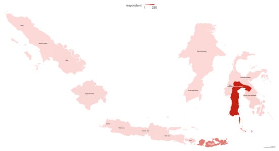 The questionnaires contain seven case-based psychometric scales ranging from [135] to assess the reputation of influencer marketing. Since the respondents were autochthonous Indonesian citizens, this same questionnaire survey was translated into Indonesian. Table 3 represents the coding criteria of variables. Meanwhile, this study used 400 respondents from 18 provinces in Indonesia, and most of them came from West Nusa Tenggara and South Sulawesi, as shown in Figure 2.