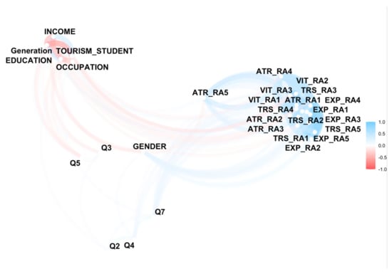 Figure 3 explains the variable information of the correlation from the dataset, and it can be seen that occupancy, birth year (generation), education, gender, information of respondents including the number of social media (Q2), type of social media (Q3), time spend (Q4), SMIs information (Q5), and a number of following SMIs (Q7) have a weak relationship. However, the expertise variable by SMIs Raffi Ahmad and Nagita Slavina has an important role in visiting tourism intention. In addition, the trustworthiness variable is also very important for Generation Y and Generation Z.