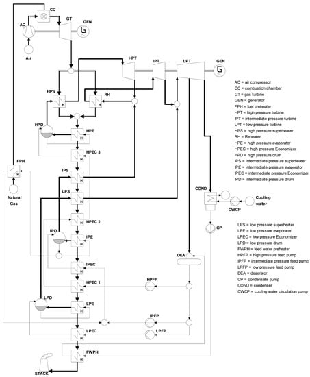 The mass flow rate, pressure, and temperature of the existing combined-cycle plant depicted in Figure 1 are reported in Table 2. The net efficiency is around 58% for the 829.797 MW power plant.