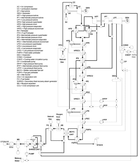 The existing power plant of Figure 1 and the proposed repowering scheme with MCFC of Figure 2 were modeled in the Cycle Tempo flow simulation software [25]. In the following, the assumptions chosen for the modeling of the two plants and the thermodynamic balance formulations are reported.