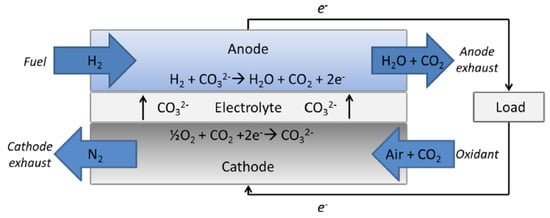 The basic working principle of an MCFC. Reprinted with permission from ref. [26], Copyright 2021 Rosaria Volpe.