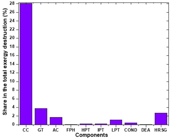 The details of the different contributions for the total exergy destruction are given in Figure 5. As can be observed, the highest contribution occurred in the combustion chamber (CC), with the destruction of around 28% of the total exergy. The gas turbine (GT), the air compressor (AC), and the heat recovery steam generator (HRSG) range around values of 2 to 4% of the total exergy destruction. The low-pressure turbine (LPT) is responsible for around 1%, followed by lower values for the fuel preheater (FPH), the high-pressure turbine (HPT), the intermediate pressure turbine (IPT), the condenser (COND), and the deaerator (DEA).