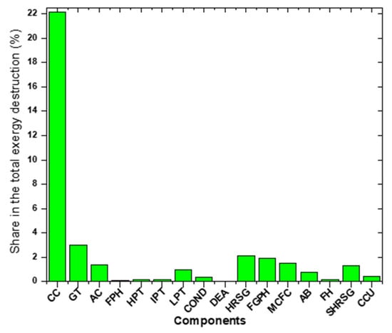 The exergy inputs of the existing natural-gas-fired combined-cycle power plants are reported in Figure 4. The amount of natural gas supplied to the retrofitted scheme is the same as the existing configuration; therefore, it can be assumed that the fuel exergy input does not vary in quantitative terms. In fact, for the repowered scheme, fuel is supplied for the operation of both the natural gas combined cycle and the MCFC. The useful exergy is around 56.21% of the total, with 40.87% of exergy destruction, and stack loss of almost 3%. The highest amount of exergy destruction can be referred to as the combustion chamber (CC), due to the significant variation between the temperature reached during combustion and the temperature at the end of the heat transfer process to the fluid.