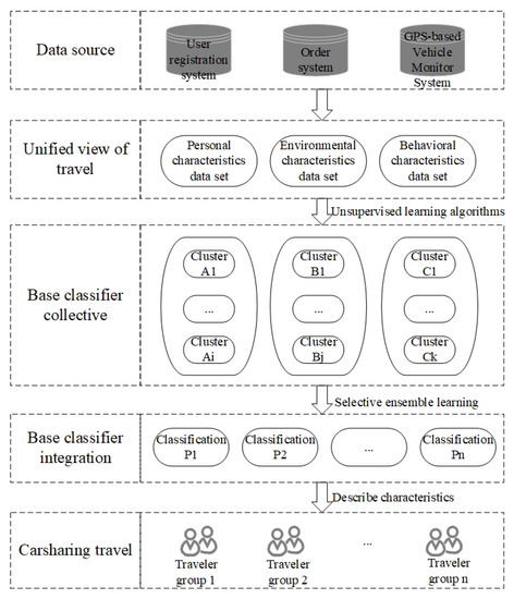Firstly, based on data, including a user registration system, order system and global positioning system (GPS)-based vehicle monitoring system, a unified view was constructed. Then, through unsupervised learning algorithms, a base classifier collective was generated for travel characteristics in each view. Moreover, high-quality base classifiers were selected for integration. Lastly, based on the above analysis’ result, characteristics of carsharing travellers were described.
