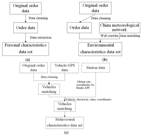As shown in Figure 2, through data cleaning and pre-processing of user order data, the personal characteristics (i.e., gender and age) of each carsharing traveller were obtained to form a personal characteristics data set. By means of data cleaning and a web crawler on the original order data, the weather conditions and air quality data from the Chinese meteorological network were obtained, and the corresponding time nodes were matched so that the environmental composition (i.e., weather conditions and air quality) of each carsharing travel event was obtained and the travel environmental characteristics data set could be formed. Through data cleaning of the order data, vehicle GPS data and the station data, the vehicle identification number (VIN) code matching the order data and vehicle GPS data was used to obtain the day of the week, travel hour, travel time, travel distance and travel speed of each carsharing travel event. Through the Baidu Map application programming interface (API), the coordinate data of the carsharing station was obtained, and then the land usage of the station was estimated, and the land usage of the destination and departure locations of the carsharing journey was obtained. After this processing, the behavioural characteristics data set was finalised.