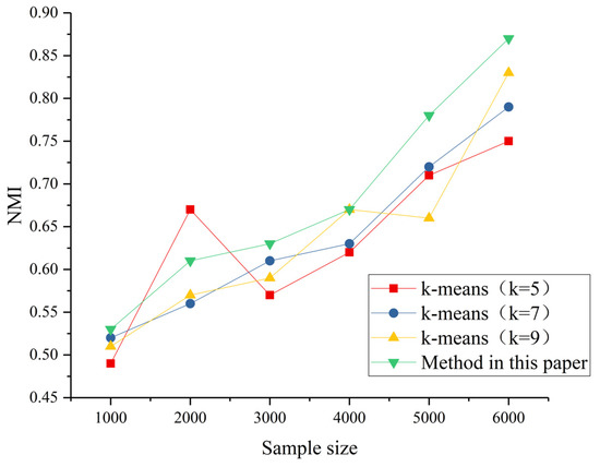 To test the performance, the selective ensemble learning model was compared with K-means clustering. The maximum number of iterations was set to 100, and the threshold of the loop stop was set to 1 × 10−5. Samples of 1000, 1500, …, 5000 were extracted from the total sample data, and the average results were output after 10 experiments. The evaluation indicator of the clustering performance adopted normalized mutual information (NMI), which is a symmetric measure that can be used to measure the shared information between two distributions [40]. The range of the NMI was from 0 to 1, and the larger the value, the better the clustering effect.