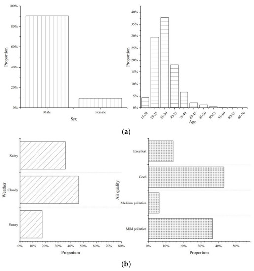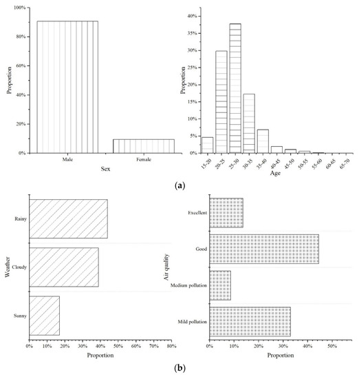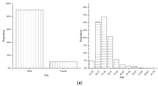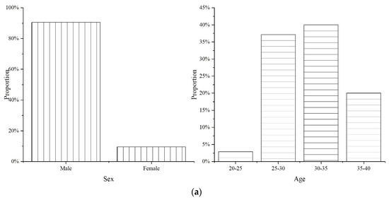 (1) Personal characteristics: As shown in Figure 4a, in the first kind of carsharing travel, the proportion of males was much higher than females, with males accounting for up to 90.5%. The majority of people are middle-aged or young, with 40% aged between 30 and 35, followed by 37.1% aged between 25 and 30 and 20% aged between 35 and 40.
