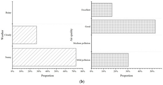 (2) Environmental characteristics: As shown in Figure 4b, air conditions of the first kind of carsharing travel were good. This kind of carsharing travel was mainly on sunny days, accounting for 72.4%, followed by cloudy days, accounting for 27.6%, and almost none on rainy days. The air quality of the first kind of carsharing travel was good, with 69.6% being excellent or good, followed by mild pollution at 30.4%. The environmental composition of this kind of carsharing travel differed greatly from that of the overall travel environment, indicating that this kind of traveller intentionally chooses to use carsharing on weekends with sunny days and good air quality, which is flexible travel.