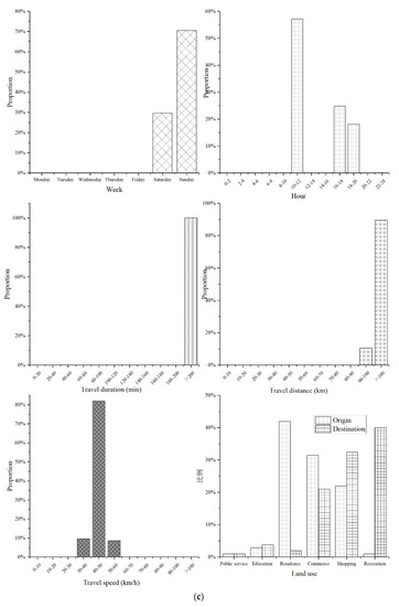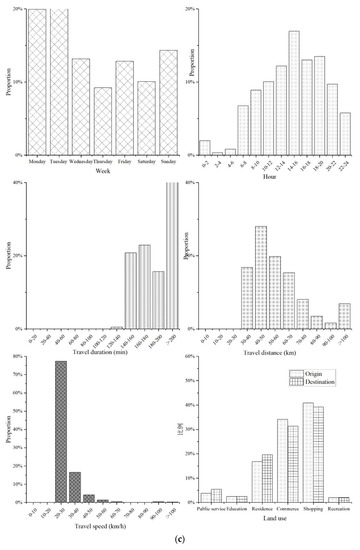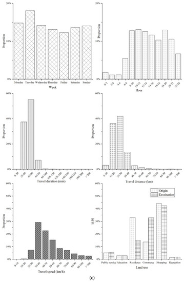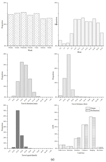 (3) Behavioural characteristics: These are depicted in Figure 5c, which show the temporal and spatial distribution of the second kind of travel. In terms of time, users mainly travelled on workdays, accounting for 14.5%, 15.2%, 15.5%, 14.2% and 15.1% from Monday to Friday. The travel time was evenly distributed throughout the day. The travel volume was high from 8:00 to 22:00, and two small peaks appeared at 12:00–14:00 and 18:00–20:00. The travel was mainly 40–120 min, accounting for 93.6%. In terms of distance, the travel distance was mainly short and middle distance: 10–30 km accounted for 85.5%. The overall average speed was low: 20–30 km/h accounted for 70.4%. The land use of origin locations were mainly retail and commercial, accounting for 76.9%, followed by residential land at 13.7%. The land use of destination locations was also dominated by retail and commercial, accounting for 75.6%, followed by residential land at 14.8%.