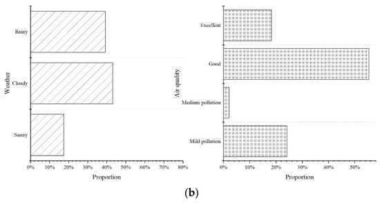 (2) Environmental characteristics: as shown in Figure 5b, weather conditions of the second type of carsharing travel were fairly evenly distributed. Cloudy, rainy and sunny days accounted for 46.5%, 35.9% and 17.7%, respectively. The proportions of good air quality and mild pollution were 43.3% and 36.6%, respectively, followed by excellent air quality, accounting for 14.0%. The environmental composition of carsharing travel was consistent with the proportion of the overall environmental composition, indicating that the second kind of carsharing travel was inflexible trips, which did not change according to environmental changes and were not affected by the external environment.