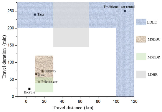 Figure 8 takes the travel distance as the x-axis and the travel duration as the y-axis. If different travel modes are in the same place, it means that they have a competitive relationship. As shown in Figure 8, LDLE carsharing travel was competitive with taxis and traditional car rental in terms of travel duration and distance; MSDBC carsharing travel was competitive with subways, buses and private cars in terms of travel duration and distance; MSDBR carsharing travel was competitive with private cars in terms of travel distance. However, the competition between bicycles and the four types of carsharing was weak in terms of travel duration and distance; the competition between LDBR carsharing travel and regular urban travel was weak. The analysis shows that there was a competitive relationship between carsharing and regular urban travel, but there was also a relationship of complementary traffic composition. Previous studies have also shown that for a large number of customers, public transport and carsharing complement each other [44]. Thus, it is important for the sustainable development of urban transportation systems to reasonably guide the development of carsharing and optimise the structure of urban transportation systems.