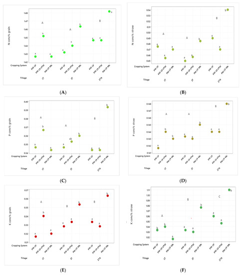 Effect of tillage practices and cropping systems on N (A,B); P (C,D); K (E,F) concentrations in pearl millet grain and stover (pooled mean of two years). In each graph, for every cluster of three data points, values with the same lowercase letter are not significantly different (at p < 0.05) according to Tukey’s HSD test, and across all data points in each graph values with the same uppercase letter are not significantly different at (p < 0.05). ZTR = zero tillage with residue retention, ZT = zero tillage, CT = conventional tillage, PM–CP = pearl millet–chickpea, PM–CP–MB = pearl millet–chickpea–mungbean, PM–CP–FPM = pearl millet–chickpea–forage pearl millet.