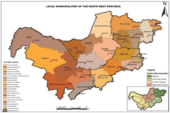 Surveys were carried out in the province of North West in South Africa (Figure 2). The province’s total land area is 106,512 square kilometres, taking up 8.7% of South Africa’s land area and still accounts for 3.2 million population in 2010, amounting to a proportion of 7.1% of the population of the country [36]. Four districts make up the Province, which are Ngaka Modiri Molema, Bojanala Platinum, Dr. Kenneth Kaunda and Dr. Ruth Segomotsi Mompati with Mahikeng as the capital city. According to the SA-Venues (1999–2015) report, Mahikeng (the capital city) enjoys the same climate around the entire province, with towns in the western areas only slightly hotter and those further south a bit cooler. The average rainfall above 300 to 700 mm is recorded annually and the summer temperatures range between 22 °C and 34 °C during winter months of May to July and this brings with it dry, sunny days and chilly nights and with temperatures ranging from an average of 2 °C to 20 °C in a single day.