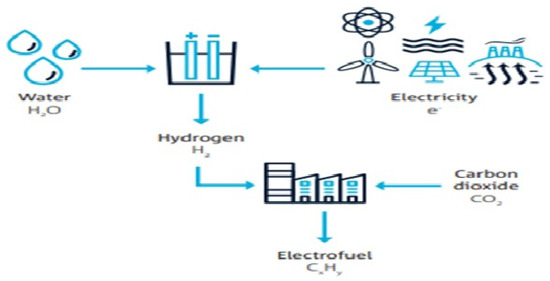 Figure 3. Electro-fuel process [11]. - Emerging infrastructure, where aircraft are being redesigned or modified to accept hydrogen fuel tanks. This area could be divided into hydrogen for propulsion and non-propulsion.