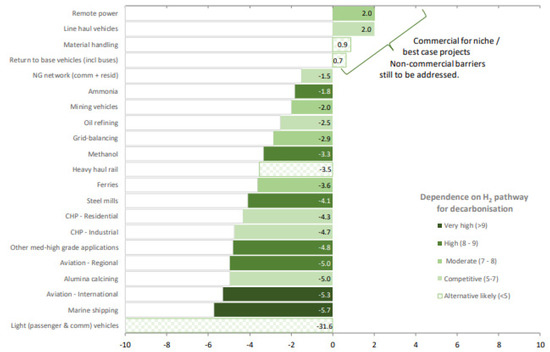 Figure 5 shows a comparison between different sectors’ uses of hydrogen in 2020. The colour scale presents the possibility of using hydrogen in other sectors. The difference between the capacity to pay and the delivery price is the economic gap for 20 industry applications in 25 industries based on the incumbent technology. The positive sign of the financial gap refers to the hydrogen-based technology being able to compete with incumbent technology economically. At the same time, the negative sign of the economic gap expresses that the current technology is still competitive [63].