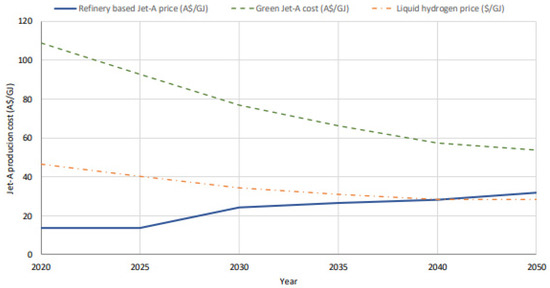 Hydrogen fuel use is insignificant in the Australian market. As presented in Figure 6, around 650 ktpa of hydrogen in Australia is produced by natural gas steam methane reforming. This process synthesises 65 percent of ammonia and 35 percent to refine crude oil. As shown in Figure 7, the aviation industry will keep relying on crude oil prices until sustainable fuel is competitive. Liquid hydrogen will become more competitive than green Jet-A and refinery-based Jet-A [63].