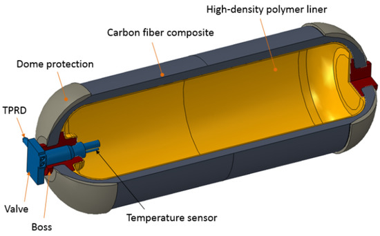 To optimise the energy density, the temperature for storing liquid hydrogen in an insulated tank has to be very low [78]. The hydrogen quantity, footprint of storage, and energy use have to be considered to select the appropriate storage technology [64]. These technologies are compression (with a gas state at 50–150 bar, 25 °C), liquefaction (with the hydrogen in liquid form at −235 °C, 1 bar), and chemical (e.g., using ammonia and metal hydrides in ambient conditions) [64]. Figure 8 illustrates the hydrogen storage parts.